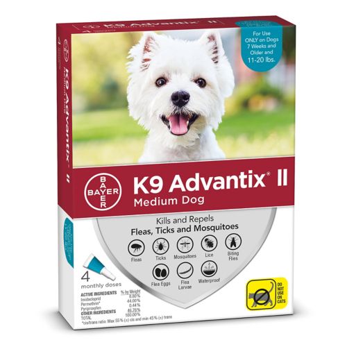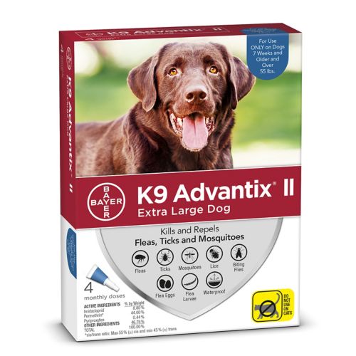 K9 Advantix II delivers pest protection through topical action. It protects against fleas (flea eggs and larvae), ticks, mosquitoes, biting flies, and lice. It combines imidacloprid and permethrin with insect growth regulator pyriproxyfen, which interferes with the hormone signaling of molting insects so that fleas in immature stages are unable to molt. K9 Advantix II is for monthly use on puppie as young as 7 weeks old and dogs. Do not use on cats.