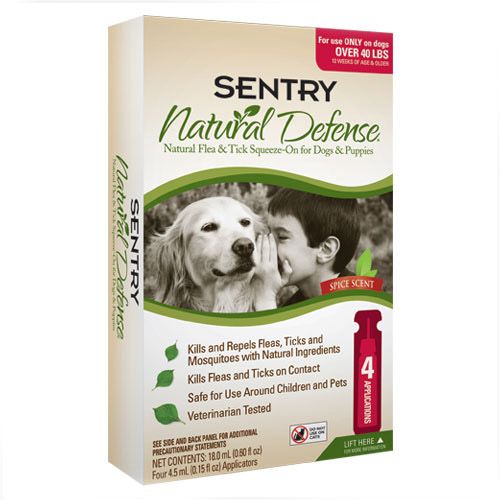 SENTRY Natural Defense Natural Flea & Tick Squeeze-On for Dogs & Puppies kills fleas, ticks, and mosquitoes for up to four weeks, yet it's safe for use around children and pets when used as directed, even in multiple-pet households. Each carton contains four applications that feature natural active ingredients such as peppermint oil, cinnamon oil, lemongrass oil and thyme oil.