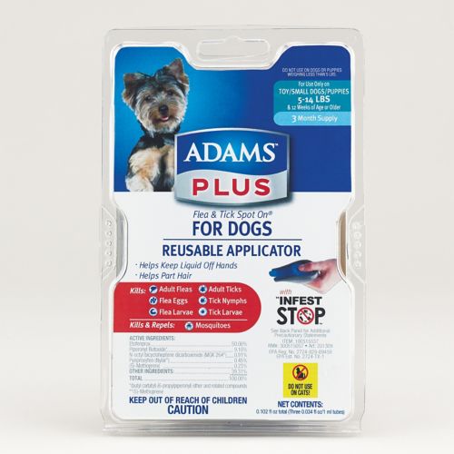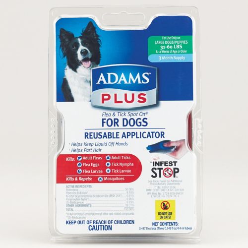 Adams Plus Flea and Tick Spot-on for dogs provides flea and tick prevention for up to 30 days - and protection from flea and tick infestations beyond. That is because it doesn't just kill adult fleas and ticks, it also knocks out flea eggs, flea larvae, tick nymphs and tick larvae that can cause a problem later on. Adams Plus also kills and repels mosquitoes.