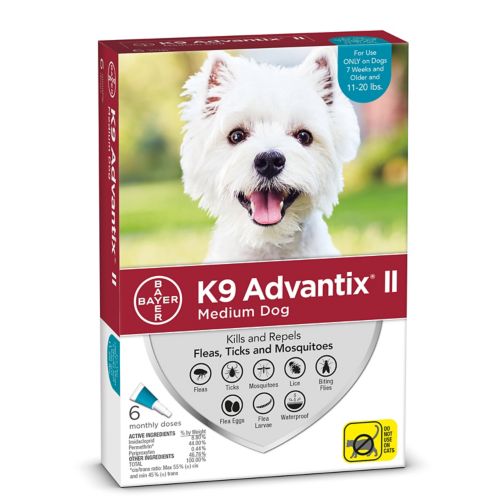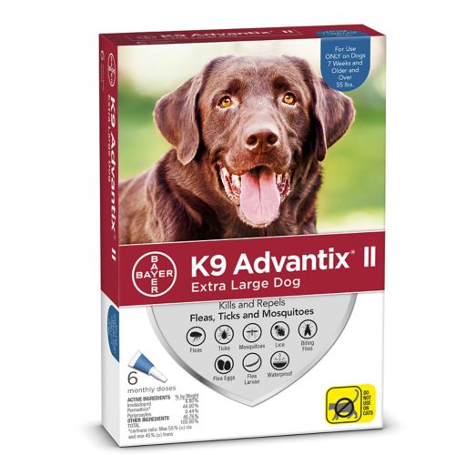 K9 Advantix II delivers pest protection through topical action. It protects against fleas (flea eggs and larvae), ticks, mosquitoes, biting flies, and lice. It combines imidacloprid and permethrin with insect growth regulator pyriproxyfen, which interferes with the hormone signaling of molting insects so that fleas in immature stages are unable to molt. K9 Advantix II is for monthly use on puppies (as young as 7 weeks old) and dogs. Do not use on cats.