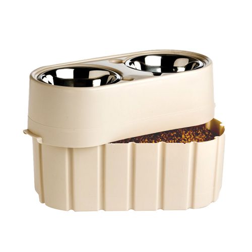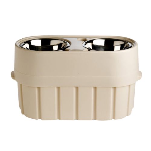 It's the feeder that grows with a dog! The Store-N-Feed is an elevated feeder that adjusts from 8 to 12 inches by rotating 180 degrees. It also has a unique self-watering feature and stores toys, treats, or up to 15 pounds of dog food. It promotes healthy feeding by minimizing digestion and bloat problems. The patented spill ridge keeps food and water off your floor. Made of heavy duty plastic, it is portable for easy traveling and includes lift out stainless steel bowls.