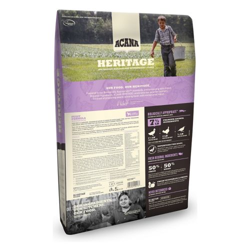 Your dog is a carnivore, designed by nature to thrive on whole game, fowl, or fish, possessing a biological need for foods that are rich and varied in animal proteins. That’s why ACANA Heritage Feast formula is loaded with free-run duck, turkey, and quail delivered fresh from their regions in richly nourishing WholePrey™ ratios that promote peak health naturally, without long lists of synthetic additives, grains, or GMO ingredients. Half of the poultry is fresh and loaded with goodness, and half is dried to provide a concentrated source of Biologically Appropriate protein that cannot be supplied by fresh meats alone. Pumpkin, greens, carrots, and apples are delivered fresh and whole from local farms and orchards and add flavor as well as important nutrients.