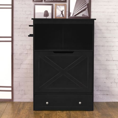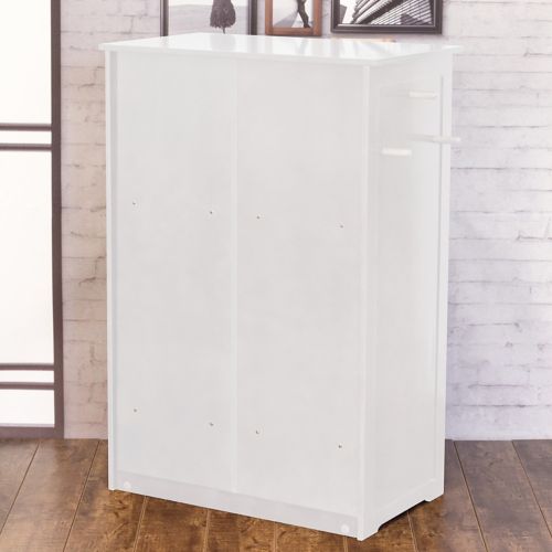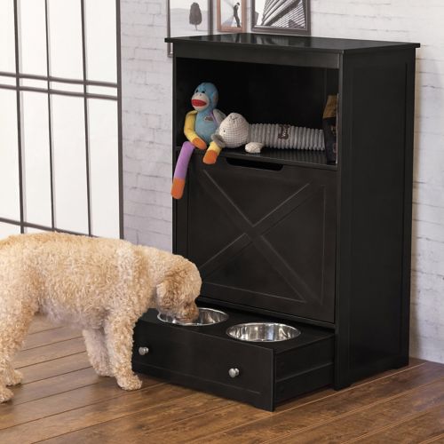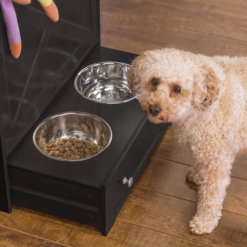 The Merry Products Windsor Pet Feeder is a perfect combination of style and function. It is an open shelf storage unit that will fit in with any decor. It has large hinged storage for dry food and holds approximately 107 cups. A two dish storage pull out drawer allows you to hide away food and water when it isn't time to eat. It has two removable bowls that each hold up to approximately 54oz (may vary based on kibble size). There are three pegs on the side for leash and other storage. It is made from MDF with a durable painted finish, so it is sure to last.