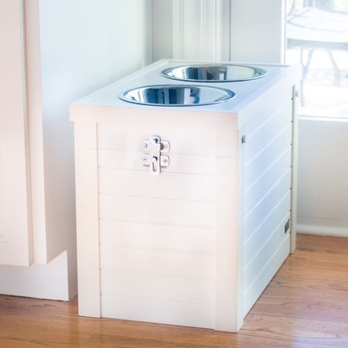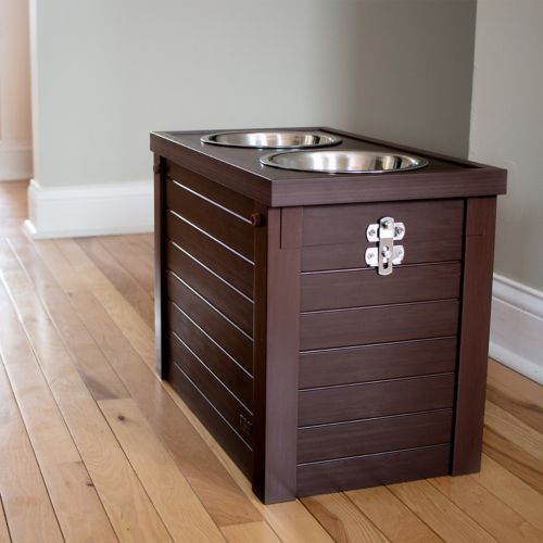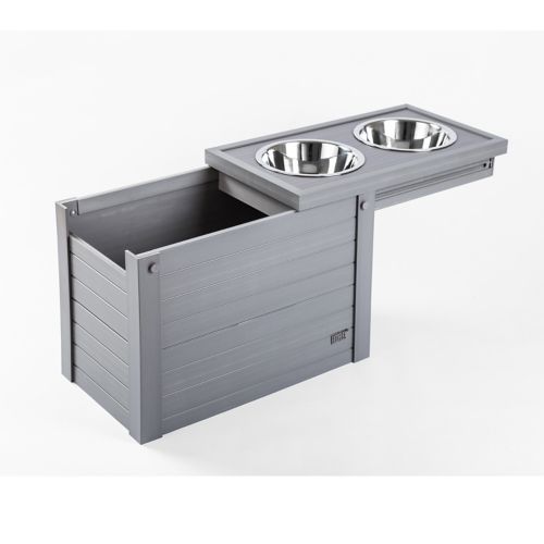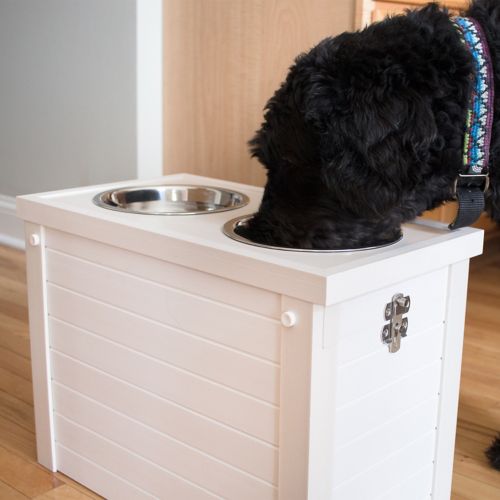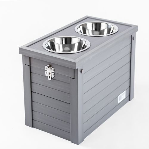 The New Age Pet ecoFlex Piedmont Dog Diner is a great combination of function and style. It is made from ecoFlex, a patented blend of recycled polymers and wood byproducts, which offers a long life cycle. This raised diner stands 15" tall, offering comfort for tall dogs during feeding and helping to make sure that your pet has good posture while eating. The lid top slides open and latches closed for food storage. The classic design makes it a great addition to any decor.