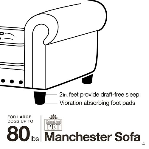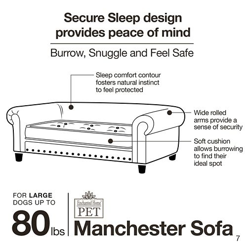 The Enchanted Home™ Pet Manchester Velvet Sofa Dog Bed is style and comfort all in one. This luxurious bed is accented with silver nailheads and biscuit tufting on the cushion. A comfy rolled back and arms make it perfect for dogs who like to lean, or curl up to sleep. It is fully upholstered with high-quality furniture-grade construction. A pocket on the back helps to keep your dog's favorite toys and treats close by.