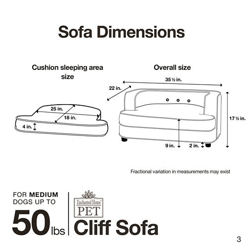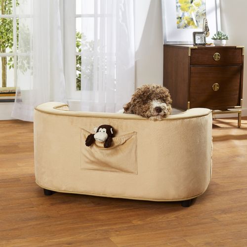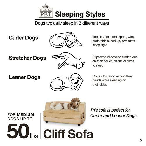The Enchanted Home Pet Cliff Caramel Sofa Dog Bed is for dogs that like to curl up when they sleep. It is a modern designed ultra plush sofa that is fully upholstered with furniture grade construction. The full loft cushion offers comfort and support. The 2" legs lift the bed off the floor, keeping your pet draft free. A storage pocket in the back is perfect for toys and bones. The removable and washable cushion cover makes it a snap to keep clean.