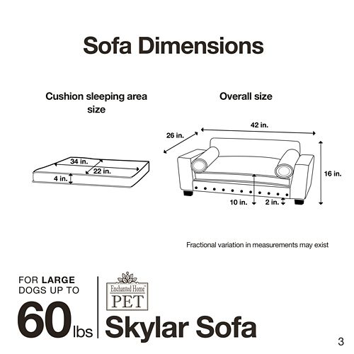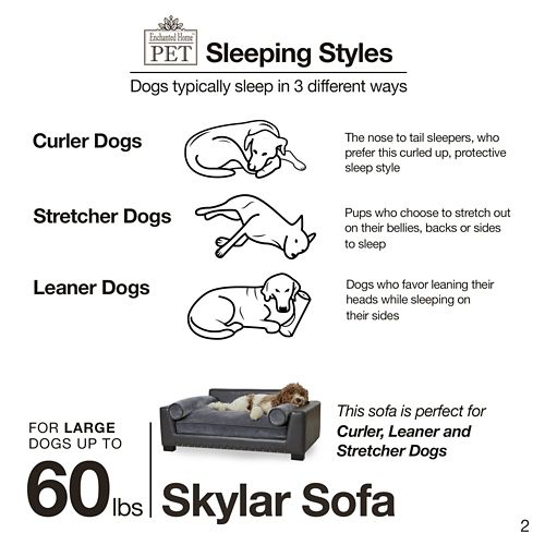 The Enchanted Home Pet Skylar Dark Grey Sofa Dog Bed is for medium dogs that like to lean and stretch when they sleep. It is a modern lounge that features dark grey pebble faux-leather with nailheads. The ultra plush cushion and two bolster pillows for lounging make it super comfortable. The 2" legs lift the bed off the floor, keeping your pet draft free. A storage pocket in the back is perfect for toys and bones. The removable and washable cushion cover makes it a snap to keep clean.