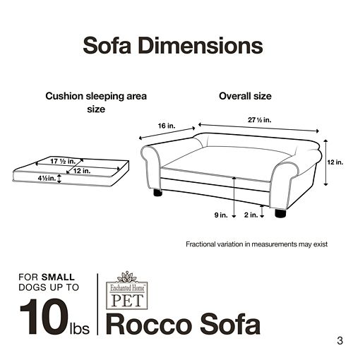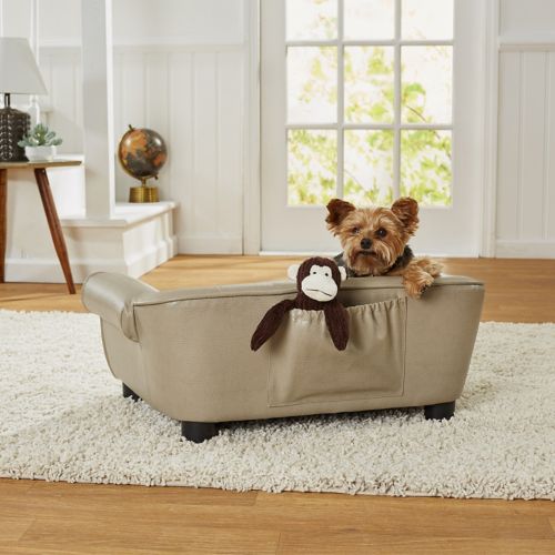 The Enchanted Home Pet Ultra Plush Rocco Stone Sofa Dog Bed is perfect little pets that like to sleep in all different styles. It is upholstered with high-quality, pebble-grain, faux-leather and a plush, embossed, micro-velvet cushion. The classic rolled arm style sofa suits the littlest pets up to 10lbs. The 2" legs lift the bed off the floor, keeping your pet draft free. A storage pocket in the back is perfect for toys and bones. The removable and washable cushion cover makes it a snap to keep clean.