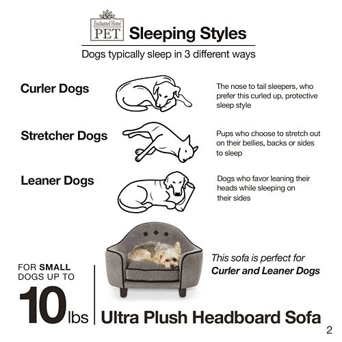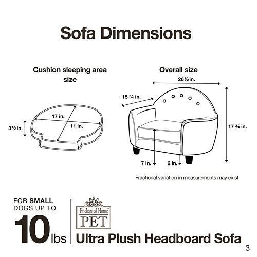 The Enchanted Home Pet Ultra Plush Headboard Grey Sofa Dog Bed is perfect for the little pet who likes to snuggle or curl while they sleep. The French Script version features a printed linen detail, which is a current home decor favorite. Upholstered with furniture grade construction and a full loft cushion for luxurious comfort. The 2" legs lift the bed off the floor, keeping your pet draft free. A storage pocket in the back is perfect for toys and bones. The removable and washable cushion cover makes it a snap to keep clean.