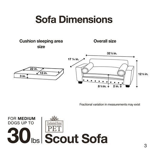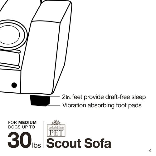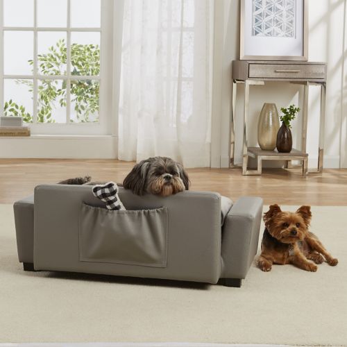 The Enchanted Home™ Pet Scout Lounger Sofa Dog Bed is modern with clean lines, perfect to match any decor. It features grey pebble faux-leather, an ultra plush seat cushion and silver nail heads. Two plush bolster cushions make a perfect lounging spot for pets who stretch out or lean while sleeping. It is fully upholstered of durable furniture-grade construction with a high-loft, milled foam cushion. A pocket on the back helps to keep your dogs favorite toys and treats close by.