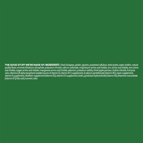 Wheat flour, wheat protein isolate, glycerin, gelatin, oat fiber, water, lecithin, natural poultry flavor, minerals (dicalcium phosphate, calcium carbonate, potassium chloride, magnesium amino acid chelate, zinc amino acid chelate, iron amino acid chelate, copper amino acid chelate, manganese amino acid chelate, potassium iodide), choline chloride, dried apple pomace, fruit juice color, vitamins (dl-alpha tocopherol acetate [source of vitamin E], vitamin B12 supplement, d-calcium pantothenate [vitamin B5], niacin supplement, vitamin A supplement, riboflavin supplement [vitamin B2], vitamin D3 supplement, biotin, pyridoxine hydrochloride [vitamin B6], thiamine mononitrate [vitamin B1], folic acid), turmeric color.