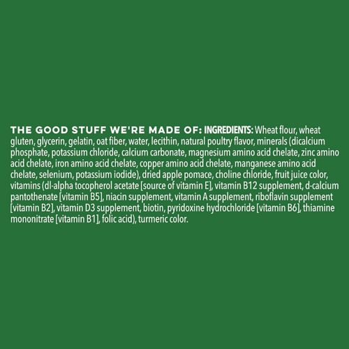 Wheat flour, glycerin, wheat protein isolate, gelatin, water, rice flour, oat fiber, pea protein, potato protein, lecithin, natural poultry flavor, apple pomace, tomato pomace, minerals (dicalcium phosphate, calcium carbonate, potassium chloride, magnesium amino acid chelate, zinc amino acid complex, iron amino acid complex, copper amino acid complex, manganese amino acid complex, potassium iodide), ground flaxseed, choline chloride, decaffeinated green tea extract, sodium copper chlorophyllin, vitamins (dl-alpha tocopherol acetate [source of vitamin E], vitamin B12 supplement, d-calcium pantothenate [vitamin B5], niacin supplement, vitamin A supplement, riboflavin supplement [vitamin B2], vitamin D3 supplement, biotin, pyridoxine hydrochloride [vitamin B6], thiamine mononitrate [vitamin B1], folic acid).