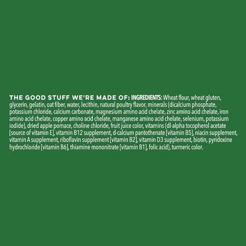 Wheat flour, glycerin, wheat protein isolate, gelatin, water, rice flour, oat fiber, pea protein, potato protein, lecithin, natural poultry flavor, apple pomace, tomato pomace, minerals (dicalcium phosphate, calcium carbonate, potassium chloride, magnesium amino acid chelate, zinc amino acid complex, iron amino acid complex, copper amino acid complex, manganese amino acid complex, potassium iodide), ground flaxseed, choline chloride, decaffeinated green tea extract, sodium copper chlorophyllin, vitamins (dl-alpha tocopherol acetate [source of vitamin E], vitamin B12 supplement, d-calcium pantothenate [vitamin B5], niacin supplement, vitamin A supplement, riboflavin supplement [vitamin B2], vitamin D3 supplement, biotin, pyridoxine hydrochloride [vitamin B6], thiamine mononitrate [vitamin B1], folic acid).