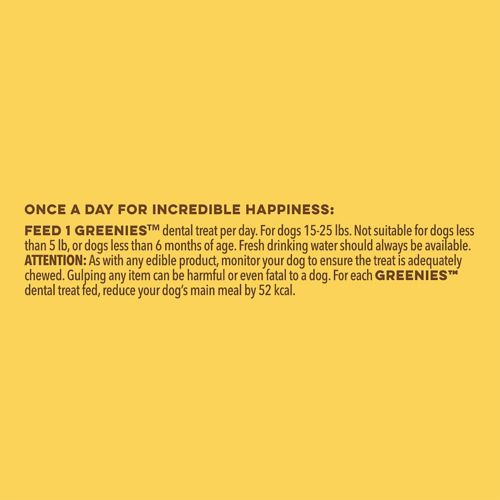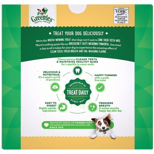 The same great GREENIES™ Dental Chews that your dog loves are now available in a grain-free version for dogs with food sensitivities. GREENIES™ are a total oral health solution. One dental chew a day helps clean your dog's teeth by using his or her natural chewing action to wipe away plaque and tartar buildup from the surface of teeth. Highly soluble ingredients help the dental chew break down quickly for easy digestion. GREENIES™ are highly palatable, great-tasting, and come in a variety of sizes to offer the most appropriate texture and hardness for dogs with a variety of bite-force capabilities.