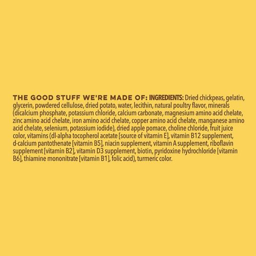 Ground chickpeas, dried potatoes, glycerin, gelatin, powdered cellulose, water, potato protein, natural poultry flavor, lecithin, minerals (dicalcium phosphate, calcium carbonate, potassium chloride, magnesium amino acid chelate, zinc amino acid complex, iron amino acid complex, copper amino acid complex, manganese amino acid complex, potassium iodide), fruit juice blend and tumeric, choline chloride, vitamins ( dl-alpha tocopherol acetate [source of vitamin E], vitamin B12 supplement, d-calcium pantothenate [vitamin B5], niacin supplement, vitamin A supplement, riboflavin supplement [vitamin B2], vitamin D3 supplement, biotin, pyridoxine hydrochloride [vitamin B6], thiamine mononitrate [vitamin B1], folic acid)