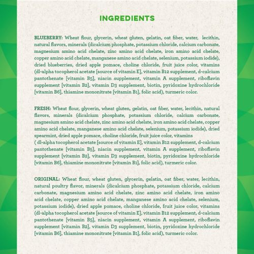 ORIGINAL: Wheat flour, wheat gluten, glycerin, gelatin, oat fiber, water, lecithin, natural poultry flavor, minerals (dicalcium phosphate, potassium chloride, calcium carbonate, magnesium amino acid chelate, zinc amino acid chelate, iron amino acid chelate, copper amino acid chelate, manganese amino acid chelate, selenium, potassium iodide), dried apple pomace, choline chloride, fruit juice color, vitamins ( dl-alpha tocopherol acetate [source of vitamin E], vitamin B12 supplement, d-calcium pantothenate [vitamin B5], niacin supplement, vitamin A supplement, riboflavin supplement [vitamin B2], vitamin D3 supplement, biotin, pyridoxine hydrochloride [vitamin B6], thiamine mononitrate [vitamin B1], folic acid), turmeric color.