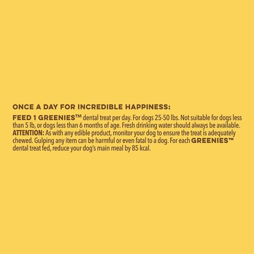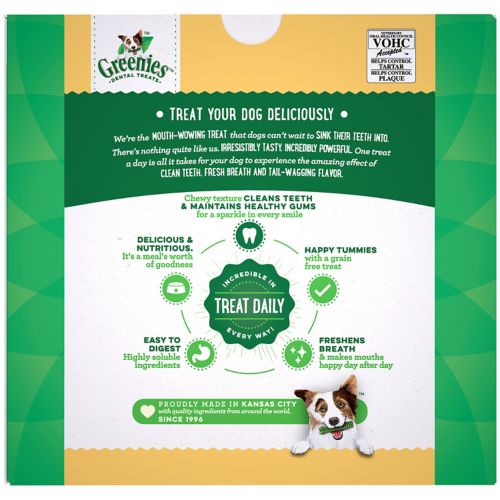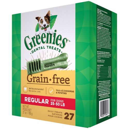 The same great GREENIES™ Dental Chews that your dog loves are now available in a grain-free version for dogs with food sensitivities. GREENIES™ are a total oral health solution. One dental chew a day helps clean your dog's teeth by using his or her natural chewing action to wipe away plaque and tartar buildup from the surface of teeth. Highly soluble ingredients help the dental chew break down quickly for easy digestion. GREENIES™ are highly palatable, great-tasting, and come in a variety of sizes to offer the most appropriate texture and hardness for dogs with a variety of bite-force capabilities.