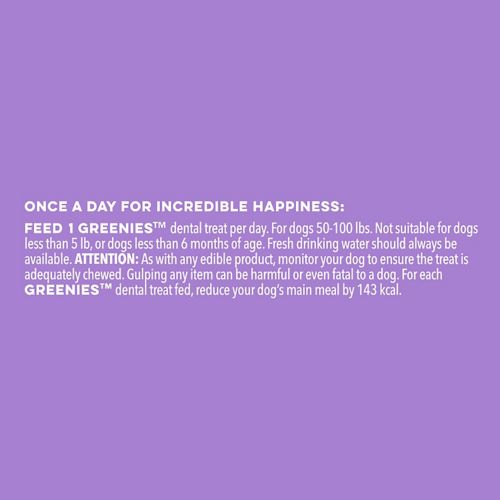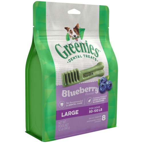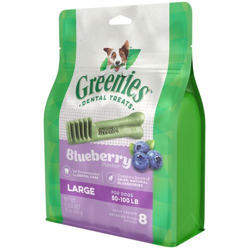 The same great GREENIES™ Dental Chews that your dog loves are now available in a delicious blueberry formula, for added delicious taste. GREENIES™ are a total oral health solution. One dental chew a day helps clean your dog's teeth by using their natural chewing action to wipe away plaque and tartar buildup from the surface of teeth and gums. Safe and easily digestible, highly soluble ingredients help the dental chew break down quickly. GREENIES™ smell delicious and have an irresistible taste. Low-calorie and low-fat, they are okay to give to your best friend on a daily basis. All natural with added vitamins and minerals, they are formulated to provide complete and balanced nutrition for adult dogs.