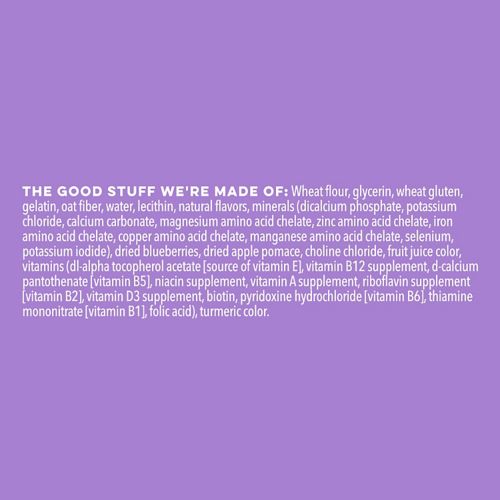 Ground whole wheat, glycerin, wheat protein isolate, gelatin, oat fiber, water, natural poultry flavor, lecithin, minerals (dicalcium phosphate, calcium carbonate, potassium chloride, magnesium amino acid chelate, zinc amino acid complex, iron amino acid complex, copper amino acid complex, manganese amino acid complex, potassium iodide), fruit juice blend and tumeric, blueberry flavor, choline chloride, vitamins ( dl-alpha tocopherol acetate [source of vitamin E], vitamin B12 supplement, d-calcium pantothenate [vitamin B5], niacin supplement, vitamin A supplement, riboflavin supplement [vitamin B2], vitamin D3 supplement, biotin, pyridoxine hydrochloride [vitamin B6], thiamine mononitrate [vitamin B1], folic acid