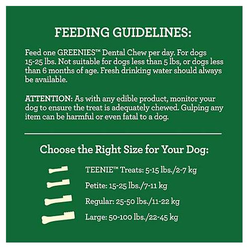 Feed 1 ntal treat per day. Not suitable for dogs less than 5 lb. or less than 6 months of age. Fresh drinking water should always be available. As with any edible product, monitor your dog to ensure the treat is adequately chewed. Gulping any item can be harmful or even fatal to a dog.