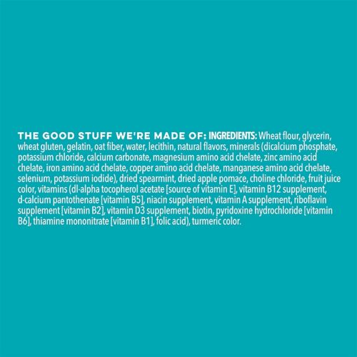 Wheat flour, glycerin, wheat protein isolate, gelatin, oat fiber, water, natural flavors, lecithin, dried spearmint, minerals (dicalcium phosphate, calcium carbonate, potassium chloride, magnesium amino acid chelate, zinc amino acid chelate, iron amino acid chelate, copper amino acid chelate, manganese amino acid chelate, potassium iodide), choline chloride, dried apple pomace, fruit juice color, vitamins ( dl-alpha tocopherol acetate [source of vitamin E], vitamin B12 supplement, d-calcium pantothenate [vitamin B5], niacin supplement, vitamin A supplement, riboflavin supplement [vitamin B2], vitamin D3 supplement, biotin, pyridoxine hydrochloride [vitamin B6], thiamine mononitrate [vitamin B1], folic acid), turmeric color