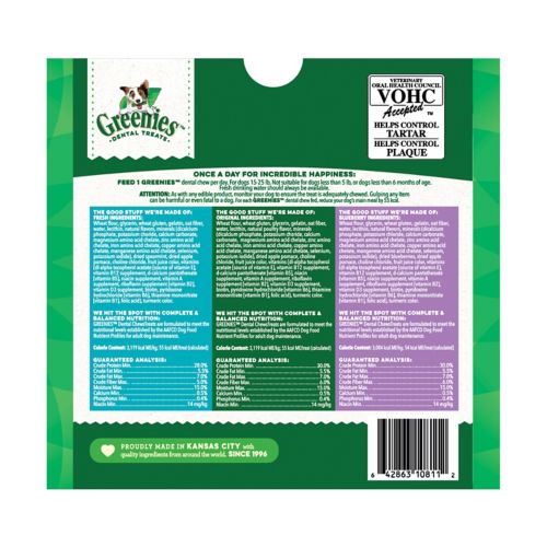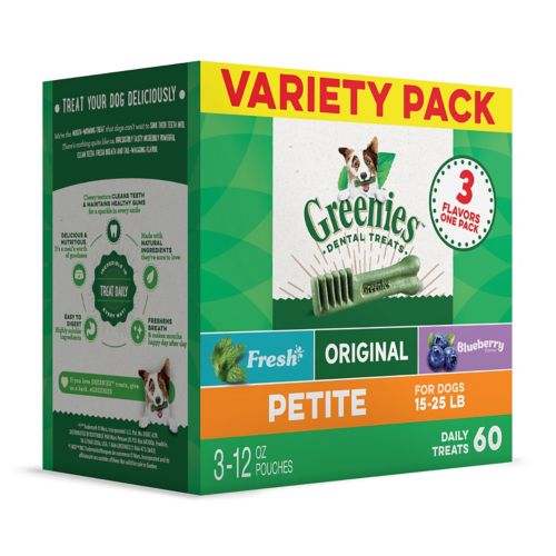 One GREENIES Dental Treat is all it takes for clean teeth, fresh breath, and a happy dog. Now you can get all of their favorite flavors in one package with this Variety Pack, featuring Original, Fresh, and Blueberry flavors. Your dog can't wait to sink their teeth into these delicious and delightfully chewy dental dog treats that fight plaque and tartar as they munch. Irresistibly tasty and incredibly powerful, GREENIES Treats for Dogs are recommended by veterinarians for at-home oral care. Best of all, these natural dog treats are made with highly soluble ingredients that are safe and easy to digest. Give your dog the mouth-wowing treat that helps promote their overall health with GREENIES Dog Treats.