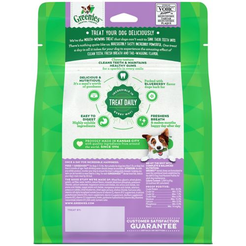 The same great GREENIES™ Dental Chews that your dog loves are now available in a delicious blueberry formula, for added delicious taste. GREENIES™ are a total oral health solution. One dental chew a day helps clean your dog's teeth by using their natural chewing action to wipe away plaque and tartar buildup from the surface of teeth and gums. Safe and easily digestible, highly soluble ingredients help the dental chew break down quickly. GREENIES™ smell delicious and have an irresistible taste. Low-calorie and low-fat, they are okay to give to your best friend on a daily basis. All natural with added vitamins and minerals, they are formulated to provide complete and balanced nutrition for adult dogs.