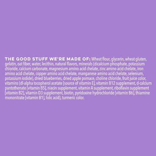 Ground whole wheat, glycerin, wheat protein isolate, gelatin, oat fiber, water, natural poultry flavor, lecithin, minerals (dicalcium phosphate, calcium carbonate, potassium chloride, magnesium amino acid chelate, zinc amino acid complex, iron amino acid complex, copper amino acid complex, manganese amino acid complex, potassium iodide), fruit juice blend and tumeric, blueberry flavor, choline chloride, vitamins ( dl-alpha tocopherol acetate [source of vitamin E], vitamin B12 supplement, d-calcium pantothenate [vitamin B5], niacin supplement, vitamin A supplement, riboflavin supplement [vitamin B2], vitamin D3 supplement, biotin, pyridoxine hydrochloride [vitamin B6], thiamine mononitrate [vitamin B1], folic acid