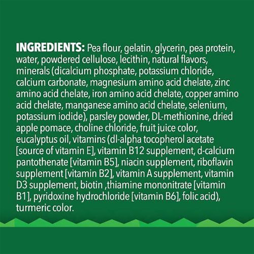 Pea flour, Gelatin, Glycerin, Pea protein, Water, Powdered cellulose, Lecithin, Natural flavors,Minerals (dicalcium phosphate, potassium chloride, calcium carbonate, magnesium amino acid chelate, zinc amino acid chelate, iron amino acid chelate, copper amino acid chelate, manganese amino acid chelate, selenium, potassium iodide), Parsley powder, DL Methionine, Dried apple pomace, Choline chloride, Fruit juice color, Eucalyptus oil, Vitamins (dl-alpha tocopherol acetate [source of vitamin E], vitamin B12 supplement, d-calcium pantothenate [vitamin B5], niacin supplement, riboflavin supplement [vitamin B2], vitamin A supplement, vitamin D3 supplement, biotin ,thiamine mononitrate [vitamin B1], pyridoxine hydrochloride [vitamin B6], folic acid), Turmeric color.