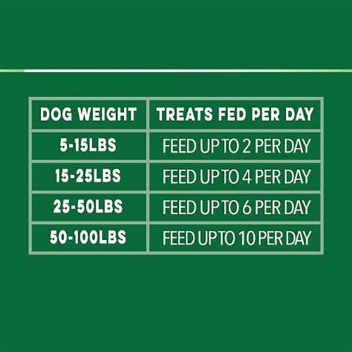 Feed anytime for fresh breath (or for a happy, healthy mouth). Not suitable for dogs less than 5 lb. or less than six months of age. Fresh drinking water should always be available. As with any edible product, monitor your dog to ensure the treat is adequately chewed. Gulping any item can be harmful or even fatal to a dog. For each GREENIES™ BREATH BUSTER™ Bites fed, reduce your dog’s dry food by 15 kcals.