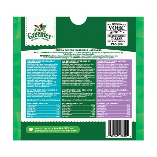 One GREENIES Dental Treat is all it takes for clean teeth, fresh breath, and a happy dog. Now you can get all of their favorite flavors in one package with this Variety Pack, featuring Original, Fresh, and Blueberry flavors. Your dog can't wait to sink their teeth into these delicious and delightfully chewy dental dog treats that fight plaque and tartar as they munch. Irresistibly tasty and incredibly powerful, GREENIES Treats for Dogs are recommended by veterinarians for at-home oral care. Best of all, these natural dog treats are made with highly soluble ingredients that are safe and easy to digest. Give your dog the mouth-wowing treat that helps promote their overall health with GREENIES Dog Treats.