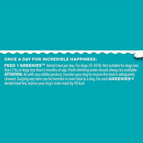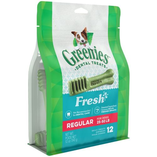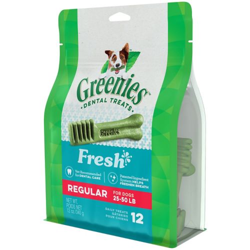 The same great GREENIES™ Dental Chews that your dog loves are now available in a Freshmint formula, for added fresh breath. GREENIES™ are a total oral health solution. One dental chew a day helps clean your dog's teeth by using their natural chewing action to wipe away plaque and tartar buildup from the surface of teeth and gums. Safe and easily digestible, highly soluble ingredients help the dental chew break down quickly. GREENIES™ smell delicious and have an irresistible taste. Low-calorie and low-fat, they are okay to give to your best friend on a daily basis. All natural with added vitamins and minerals, they are formulated to provide complete and balanced nutrition for adult dogs.