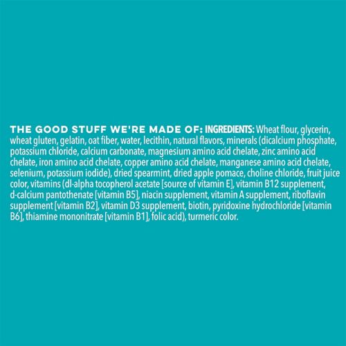 Wheat flour, glycerin, wheat protein isolate, gelatin, oat fiber, water, natural flavors, lecithin, dried spearmint, minerals (dicalcium phosphate, calcium carbonate, potassium chloride, magnesium amino acid chelate, zinc amino acid chelate, iron amino acid chelate, copper amino acid chelate, manganese amino acid chelate, potassium iodide), choline chloride, dried apple pomace, fruit juice color, vitamins ( dl-alpha tocopherol acetate [source of vitamin E], vitamin B12 supplement, d-calcium pantothenate [vitamin B5], niacin supplement, vitamin A supplement, riboflavin supplement [vitamin B2], vitamin D3 supplement, biotin, pyridoxine hydrochloride [vitamin B6], thiamine mononitrate [vitamin B1], folic acid), turmeric color