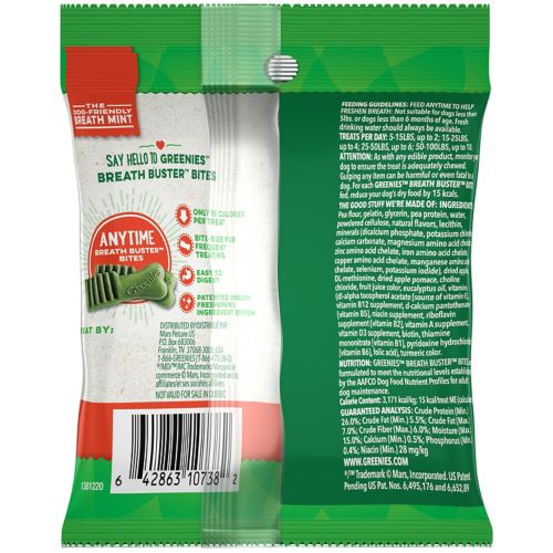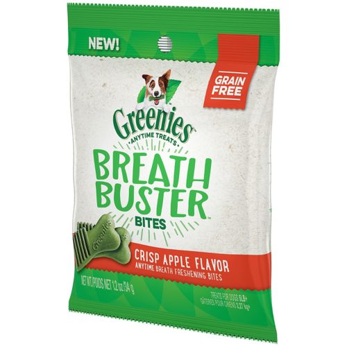 Eliminate bad doggie breath on demand with GREENIES BREATH BUSTER Bites. Made with a patented breath-freshening ingredient system, these bite-size dog treats are low in calories for frequent treating. That means both you and your dog can enjoy the benefits of fresher breath more often. Your dog will love the flavor, and you will like that these grain-free dog treats are made with safe, easy-to-digest ingredients. For when your dog's licks are less than loveable, give them a new level of kissable confidence with this dog-friendly breath mint.
