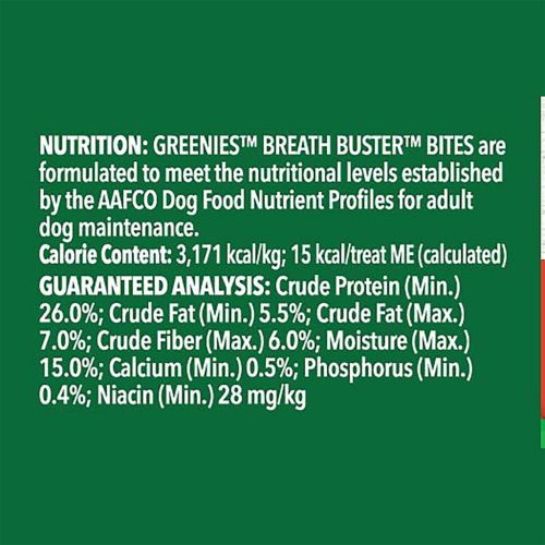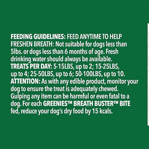 Feed anytime for fresh breath (or for a happy, healthy mouth). Not suitable for dogs less than 5 lb. or less than six months of age. Fresh drinking water should always be available. As with any edible product, monitor your dog to ensure the treat is adequately chewed. Gulping any item can be harmful or even fatal to a dog. For each GREENIES™ BREATH BUSTER™ Bites fed, reduce your dog’s dry food by 15 kcals.