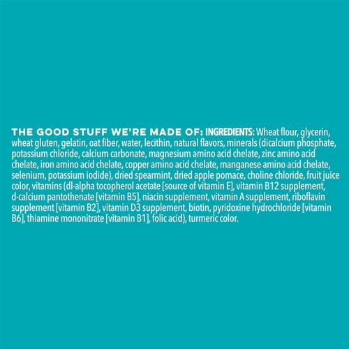 Wheat flour, glycerin, wheat protein isolate, gelatin, oat fiber, water, natural flavors, lecithin, dried spearmint, minerals (dicalcium phosphate, calcium carbonate, potassium chloride, magnesium amino acid chelate, zinc amino acid chelate, iron amino acid chelate, copper amino acid chelate, manganese amino acid chelate, potassium iodide), choline chloride, dried apple pomace, fruit juice color, vitamins ( dl-alpha tocopherol acetate [source of vitamin E], vitamin B12 supplement, d-calcium pantothenate [vitamin B5], niacin supplement, vitamin A supplement, riboflavin supplement [vitamin B2], vitamin D3 supplement, biotin, pyridoxine hydrochloride [vitamin B6], thiamine mononitrate [vitamin B1], folic acid), turmeric color