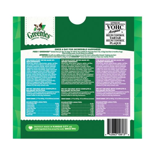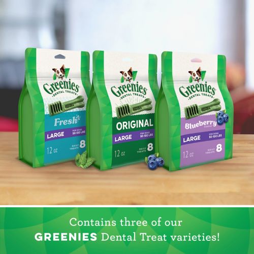 One GREENIES Dental Treat is all it takes for clean teeth, fresh breath, and a happy dog. Now you can get all of their favorite flavors in one package with this Variety Pack, featuring Original, Fresh, and Blueberry flavors. Your dog can't wait to sink their teeth into these delicious and delightfully chewy dental dog treats that fight plaque and tartar as they munch. Irresistibly tasty and incredibly powerful, GREENIES Treats for Dogs are recommended by veterinarians for at-home oral care. Best of all, these natural dog treats are made with highly soluble ingredients that are safe and easy to digest. Give your dog the mouth-wowing treat that helps promote their overall health with GREENIES Dog Treats.