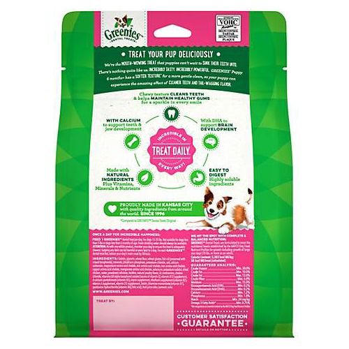 The GREENIES Puppy Dental Chew Treat is a great way to get your dog off on the right paw. It's the same great GREENIES treat you know, but with added benefits for your growing puppy. Added calcium supports jaw health and teeth development, and DHA is added to support brain development. The texture is softer to gently clean teeth and gums. It is made with natural ingredients plus vitamins, minerals, and nutrients. As always, it is an easy-to-digest recipe.