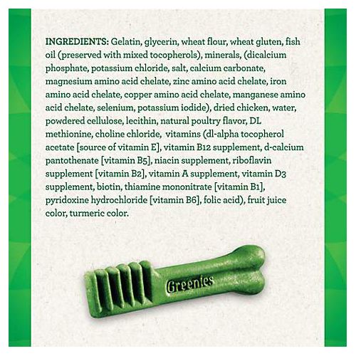 Gelatin, glycerin, wheat flour, wheat gluten, fish oil (preserved with mixed tocopherols), minerals (dicalcium phosphate, potassium chloride, salt, calcium carbonate, magnesium amino acid chelate, zinc amino acid chelate, iron amino acid chelate, copper amino acid chelate, manganese amino acid chelate, selenium, potassium iodide), dried chicken, water, powdered cellulose, lecithin, natural poultry flavor, DL methionine, choline chloride, vitamins (dl-alpha tocopherol acetate (source of vitamin E), vitamin B12 supplement, d-calcium pantothenate (vitamin B5), niacin supplement, riboflavin supplement (vitamin B2), vitamin A supplement, vitamin D3 supplement, biotin, thiamine mononitrate (vitamin B1), pyridoxine hydrochloride (vitamin B6), folic acid), fruit juice color, turmeric color.
