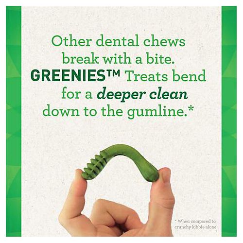 Feed one GREENIES dental treat per day. Not suitable for dogs less than 5 lb. or dogs less than 6 months of age. Fresh drinking water should always be available. As with any edible product, monitor your dog to ensure the treat is adequately chewed. Gulping any item can be harmful or even fatal to a dog.