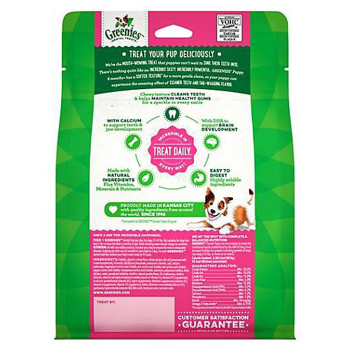 The GREENIES Puppy Dental Chew Treat is a great way to get your dog off on the right paw. It's the same great GREENIES treat you know, but with added benefits for your growing puppy. Added calcium supports jaw health and teeth development, and DHA is added to support brain development. The texture is softer to gently clean teeth and gums. It is made with natural ingredients plus vitamins, minerals, and nutrients. As always, it is an easy-to-digest recipe.
