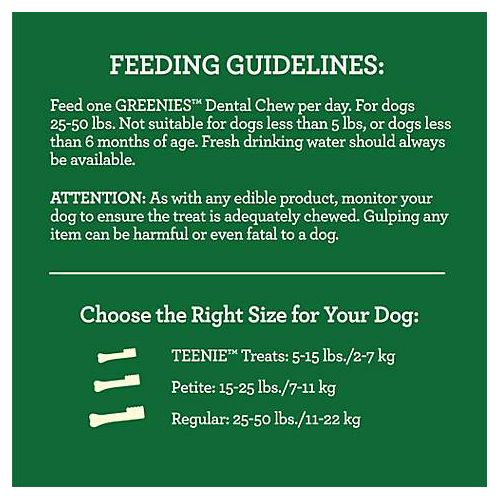 Feed one GREENIES dental treat per day. Not suitable for dogs less than 5 lb. or dogs less than 6 months of age. Fresh drinking water should always be available. As with any edible product, monitor your dog to ensure the treat is adequately chewed. Gulping any item can be harmful or even fatal to a dog.