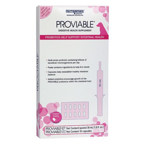 Proviable products are multi-strain probiotic products that also contain prebiotics. Both formulations contain seven strains of probiotic micoorganisms with two prebiotics; the Proviable-KP paste also contains kaolin and pectin (natural ingredients that help to firm loose stools by coating and soothing the G.I. tract and help to support normal intestinal function). Proviable-KP paste and Proviable-DC caps can be administered when your pet experiences diarrhea due to an intestinal imbalance. Proviable-KP is a tasty paste that can be given by mouth to the pet to help form the stools while both the paste and the caps help to reestablish healthy intestinal balance. The caps can also be given during and after antibiotic therapy and before stressful conditions to help support intestinal health. Can also be used long-term.