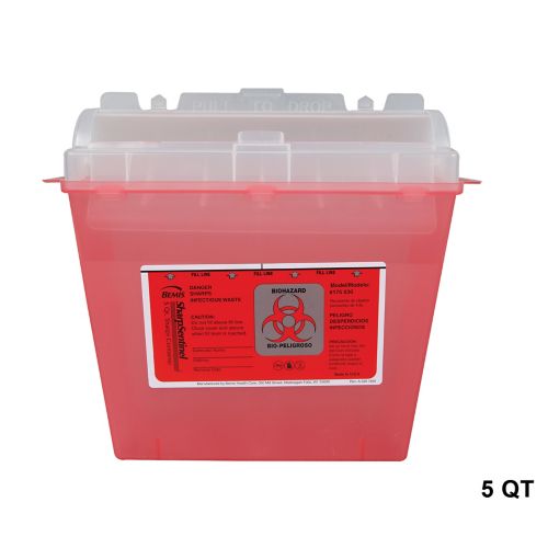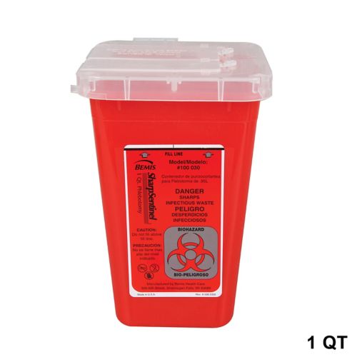 Environmentally safe way to dispose of used needles, blades and similar objects. Designed for safe use, effectively blocking hand access from discarded sharps. Unit snaps together, permanently locking with tight seams between the bases and covers. Walls are puncture resistant, too, meeting or exceeding ASTM standards.