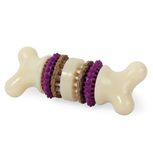 Features nylon bone ends and bristles, rubber nubs and replaceable rawhide treat rings