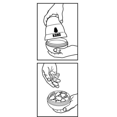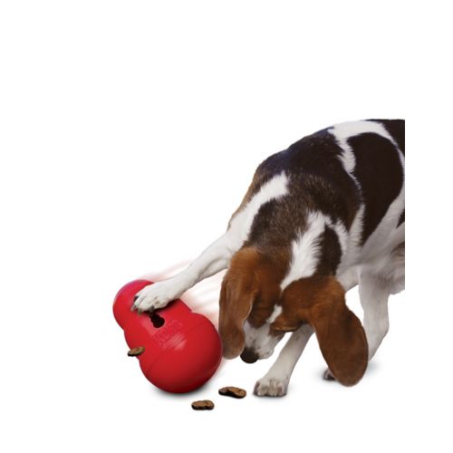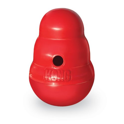 The KONG Wobbler treat dispensing dog toy is action packed entertainment for your dog. Standing upright the Wobbler turns rotates with your dog’s paw and nose periodically dispensing the tasty treats hidden inside.
