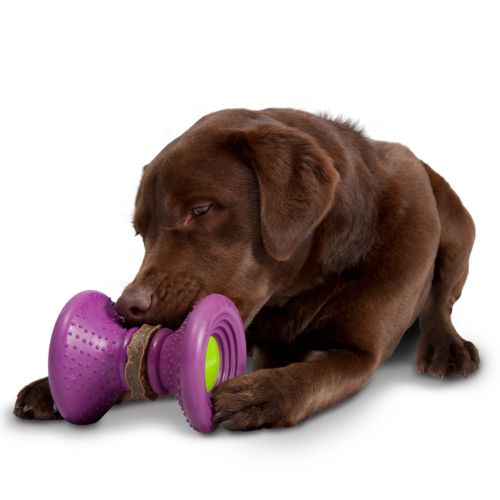 Dogs love to chew, and this toy is designed with determined chewers in mind. The extra-wide ends of the toy protect a single ultra-thick rawhide treat ring. The ring is four times thicker than regular Busy Buddy rawhide rings, to make it more difficult for dogs to get a grip on the rawhide, so it will hold a dog’s interest for a long time.