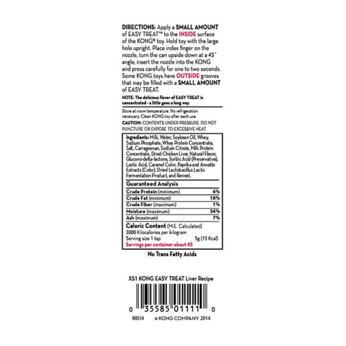 KONG Easy Treats are delicious treats that delight all types of dogs while providing an easy no-mess solution for pet parents. Made in the USA, this highly-digestible and trans-fat free treat is an enticingly delicious addition when added to a stuffed KONG. A uniquely designed nozzle easily controls the amount of KONG Easy Treat while also having the added benefit of a convenient, no-mess stuffing solution. To make your stuffed KONG last longer, freeze it for a longer-lasting, mind occupying challenge. No refrigeration required.