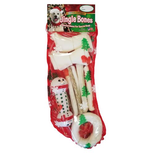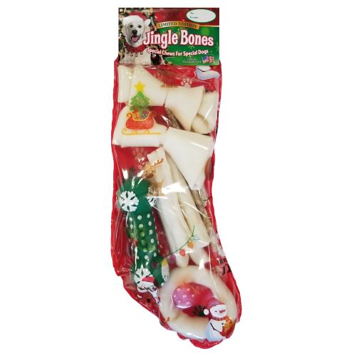 The Holiday Rawhide Stocking Dog Treat is a festive way to reward your dog for being good all year! Each style has a mix of knotted bones, rawhide rolls, munchy sticks and a nylon squeaky toy. With a variety of favorites, the enjoyment will last long past the holiday season.
