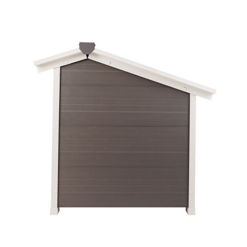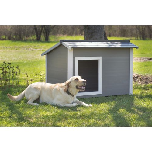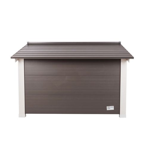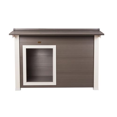 The New Age Pet ecoFLEX ThermoCore Dog House provides extreme insulation from hot and cold weather. Made with ecoFLEX, a material comprised of post-consumer recycled polymers and wood fibers, this is a truly green product in the outdoor dog house category. Combining the best characteristics of polymers and wood, ecoFLEX dog houses are resistant to pests, rot, weather, and moisture. Constructed with double wall paneling, the ThermoCore insulation keeps harsh weather out and provides a mild climate while your dog is inside. It is all-weather-proof and resists moisture and moisture related damage.